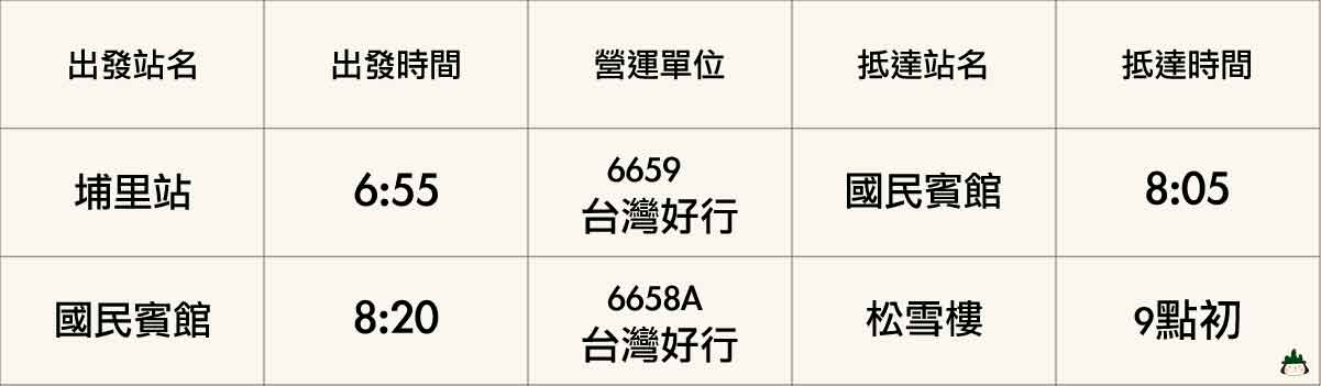 ❮ 建議搭6659,接駁上6658A的時間比較剛好 ❯6658A:國民賓館 ➞ 松雪樓
